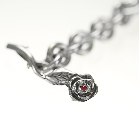 しっとりと肉厚な唇モチーフのカンに、バラをくわえさせて装着。上唇中央はハートをイメージさせるプロポーションにアレンジしているのがリップスの遊び心。バラの T バーはどちら向きにも装着できますが、画像のように、唇に向かってバラの花が右側にくるよう合わせるとキレイに収まります。