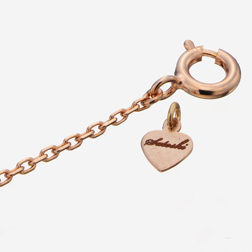 使用モチーフ「Lip SAKURA(縦横サイズ:約5mm・ダイヤ直径:約3mm)」。4人の上唇と1人の下唇を配列して桜の花に見立てたオリジナルモチーフ「Lip SAKURA」。向かって右下の唇(花弁)のみを下唇にアレンジし、アシンメトリーなモチーフワークで魅せるのが遊び心。モチーフパーツの素材は K18 SAKURA ゴールドを使用。K10ピンクゴールドのチェーンと合わせてさり気なくコントラストを効かせ、モチーフを引き立てる。