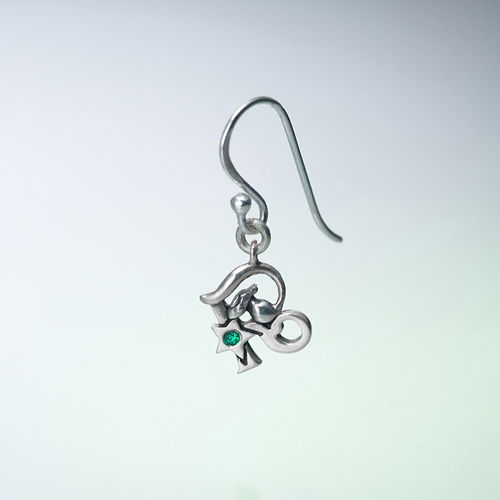 ランカをイメージさせる「星」、ペットの「アイくん」モチーフを MIX して、 ランカのイニシャル「R」に落とし込んだデザイン。「R」の上半分は、シッポを頭上に巻き上げたアイくんに! そしてハートにはランカのイメージカラー、スワロ(エメラルド)をセットしている。コーディネートすると「R」が斜めに吊り下がるのもポイント! イニシャル・フォントはプリティ系。