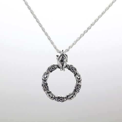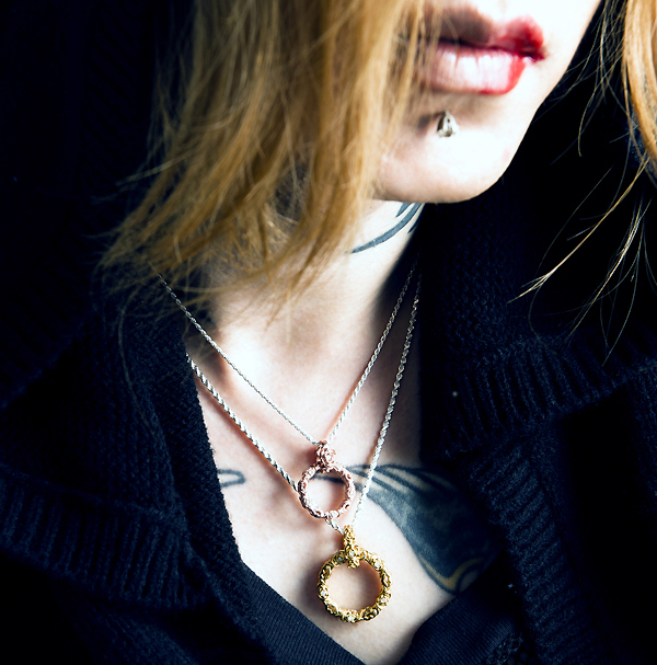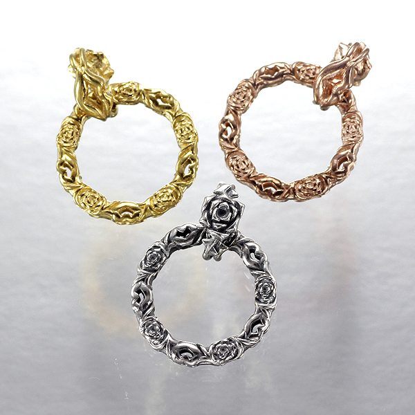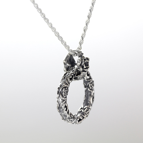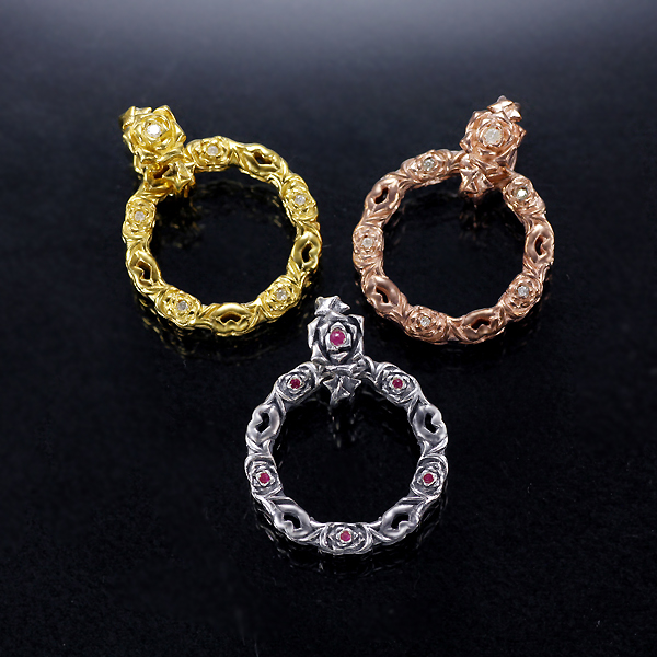 ペンダントとしてはもちろん、サングラスホルダーとしても使える厚みにある仕上がり。リング状のトップは両面同デザインのリバーシブル、バチカンはバラと唇とでデザインをアレンジしたリバーシブル。バチカンの内側を「8」の字シルエットにすることで、トップのリングは回転させつつバチカンの反転を防止。オモテと裏で2通りのコーデにアレンジ出来る。
