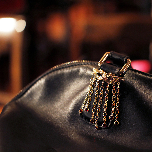 仮面部分はゴールド色のオリジナル素材「キュアル」 、チェーンにはイエローゴールドFLDを使用。仮面からストーンチャームをドロップし、ドレッシーなイメージと動きのあるコーデを演出。