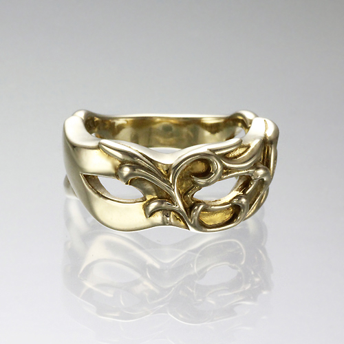 人は心にペルソナ(仮面)を着け、対外的には本心を隠しているともいわれる。そんな人間の内に秘める二面性を「クール × 妖艶」のイメージで表現した仮面モチーフ。向かって左半面は鏡面でシンプルに仕上げたクール面。向かって右半面はデコラティブに仕上げた妖艶面。アラベスクのレリーフや、目にセットしたシンセティックルビーによって優雅な表情を魅せる。