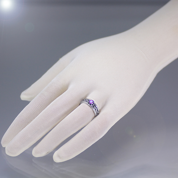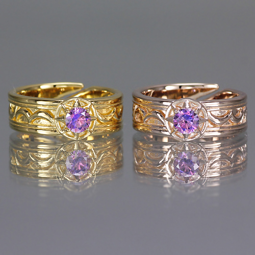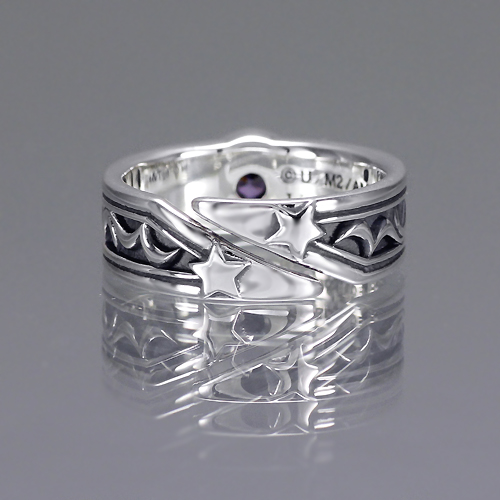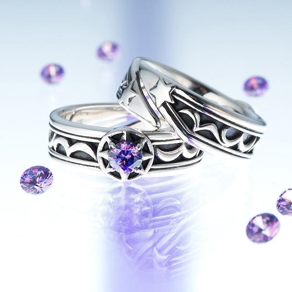 「要」が左手人差し指に着けているリングをモチーフに、女性も着けやすいよう細身にアレンジしたおそろい感覚のリング。太陽をイメージした中央には、見る角度によって七色を放つディフュージョンパープル キュービックジルコニアが輝く。