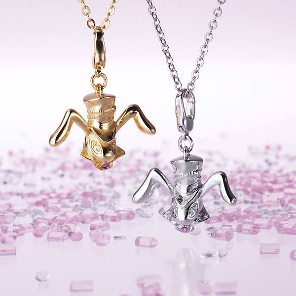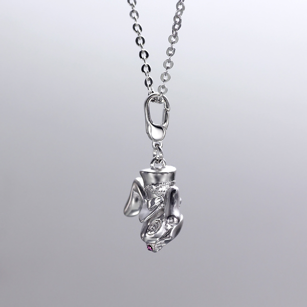 サイドアングルイメージ。シルクハットのシルエットや、大きく飛び出した兎の耳に至るまで、どの角度から見ても抜かりない立体仕上げ。シルバーカラー・ゴールドカラーともに、それぞれ同色のネックレスチェーンをサービスで付属。