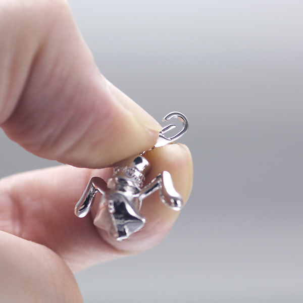 バネ式クリップタイプのパーツを使い、さまざまな場所に簡単に脱着できるギミックを備える。ペンダントとしてはもちろん、ブレスレットやアンクレット、バッグやサイフ、ストラップ、ファスナーなどなど…。好きなものに付けられるチャームだからアレンジ自由!