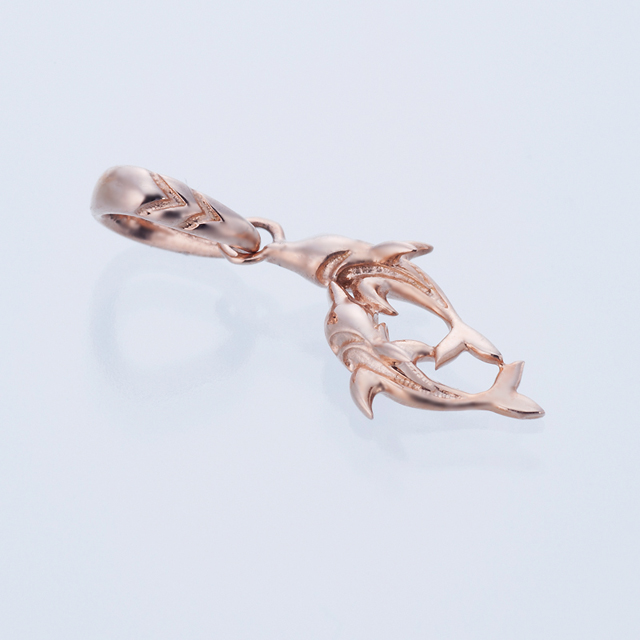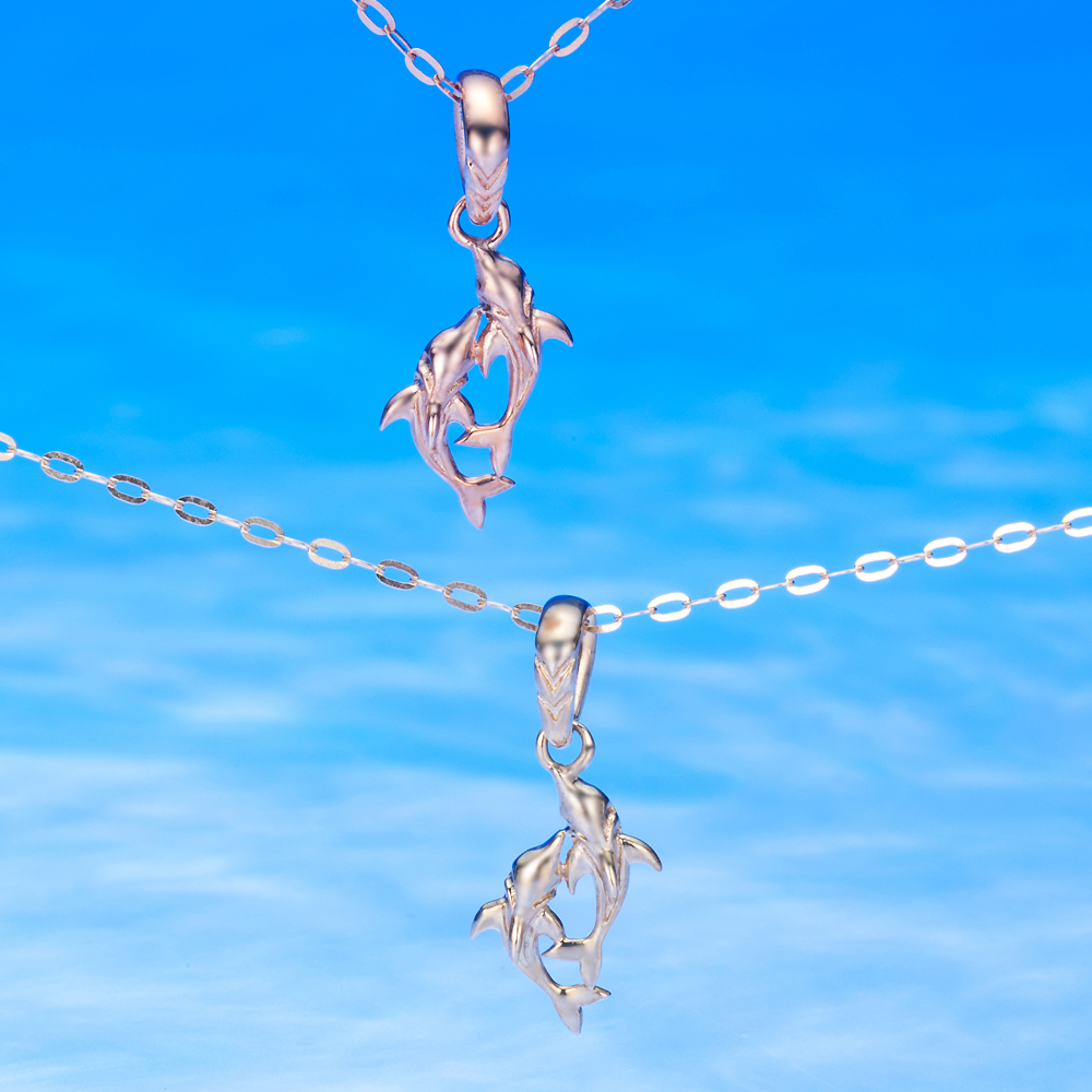 まるでバトンを繋ぐようなしぐさで、寄り添いながら躍動する2頭のイルカ。ハワイでは「幸運を呼ぶ使者」として、恋愛運アップのアイコンとしても重宝されている。チャームには通常 ver.と同様、サービスチェーン(※簡易チェーン 40cm)を付属。左画像にあるK10ゴールドチェーンは別売「+7,560円」にて。<チャームと同色(ピンク or イエロー)のK10ゴールドチェーンにバージョンアップ可。変更ご希望の場合は、カートに入れてから注文フォームの連絡事項欄に「ゴールドチェーン」と要明記>