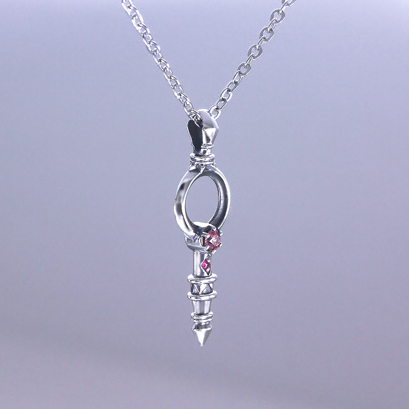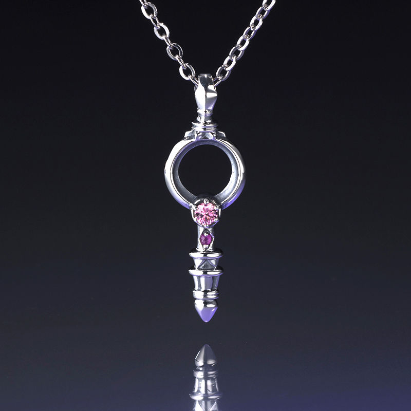錬金術の国・アルケミアの王子「ルルス」から貴女への贈り物をイメージしたペンダント。彼が持っているロッド(杖)を胸元にまとって。ルルスのイメージカラーでドレスアップすべく、七色の光彩を秘めるディフュージョンピンクキュービックジルコニアと、天然石ルビーを添えて。ルビー:宝石言葉「情熱・愛の疑惑・勇気・美・優雅 etc」
