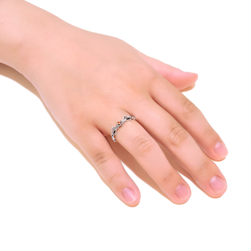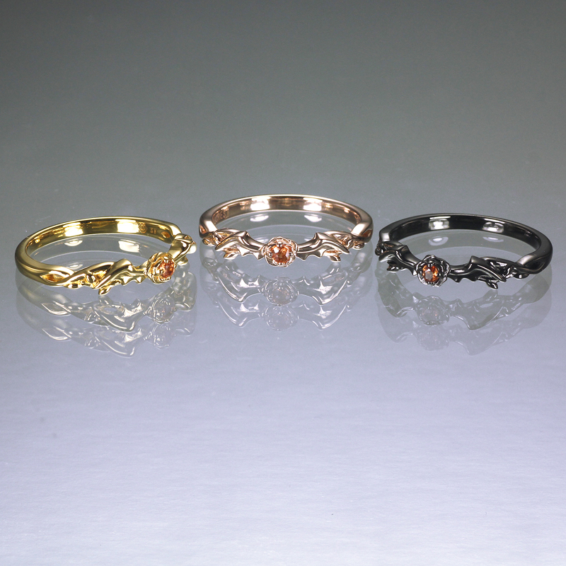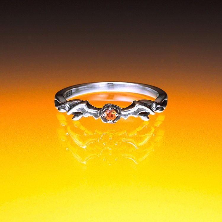 紅茶の国・ダジルベルクの王子「エドモント」からあなたへ、ハロウィンの贈り物をイメージしたリング。天然石オレンジサファイアを包んだ薔薇にコウモリの羽をしたがえた大人っぽくも妖艶なデザインは、あなたの指を華麗に彩ります。