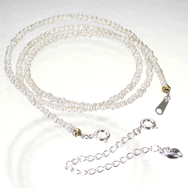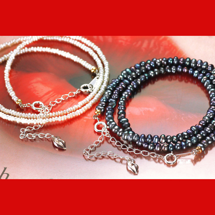 極小の淡水ケシパールは穴開けなど困難を極めるため通常かなり高額で取引されています。写真程度に不揃いな粒も含みますが、かなり照りも良く絶対的なプライスバリューあり! エンドにシルバーの唇チャームを連結したシルバーアジャスター(約7cm)は脱着可能。飾りとしてドロップするもよし、外してコーデするもよし。