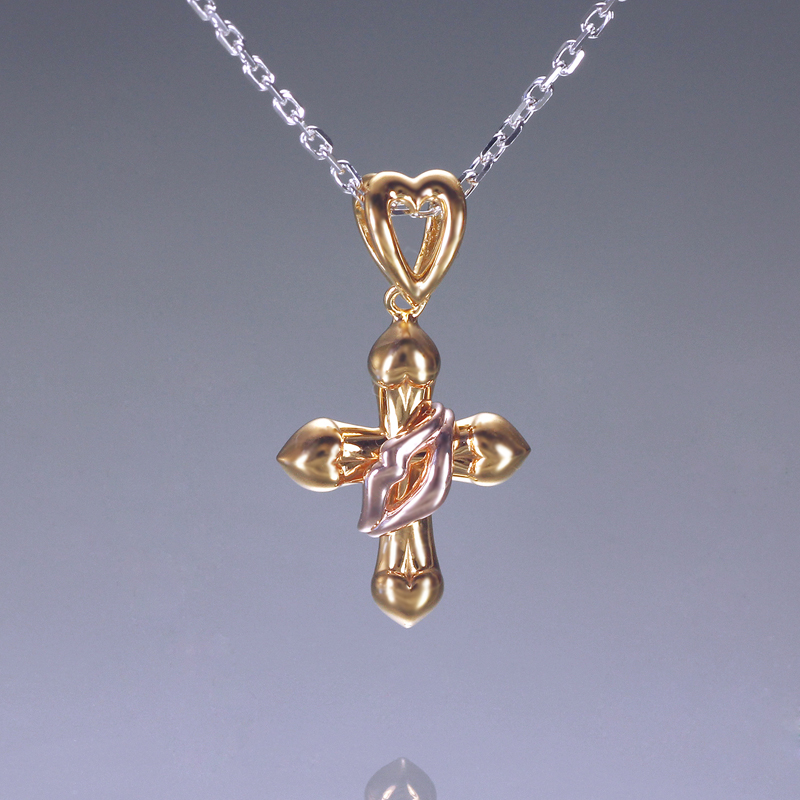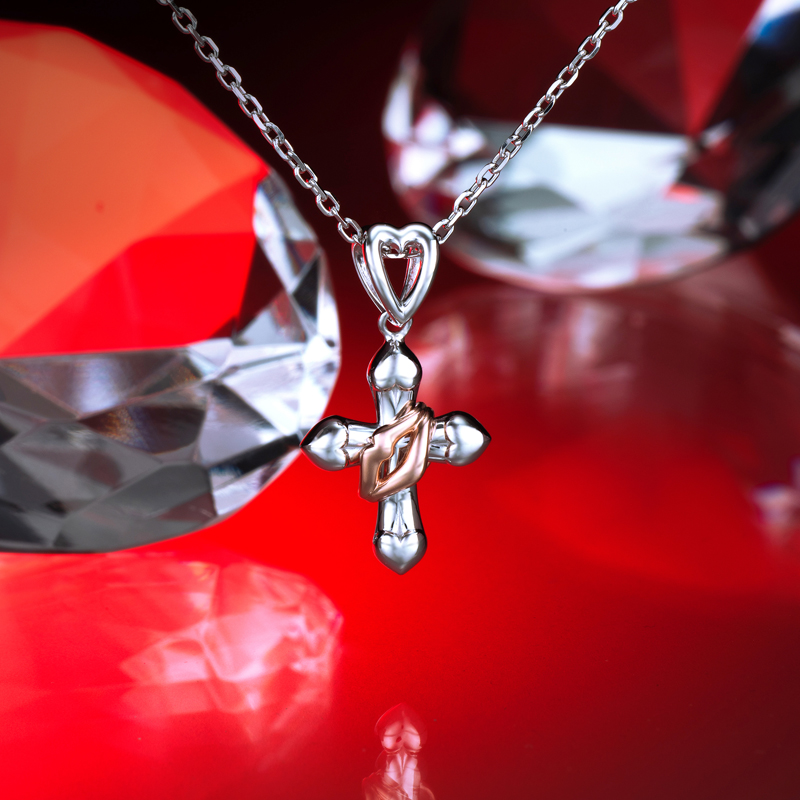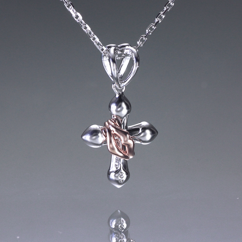 唇・クロス・ハートでスマートに構成しつつ、裏テーマ「secret LOVE」のイマジネーションを秘めるプロポーション。3ピースで構成したチャーム本体すべて、シルバーボディにコーティングを施すルージュカスタムでドレスアップ。唇はリップゴールドルージュ 、クロスとハート(バチカン)はロジウムルージュをまとっているから素材コントラストがより華やかに。シルバーアクセ特有の、経年変化によるくすみがありません。