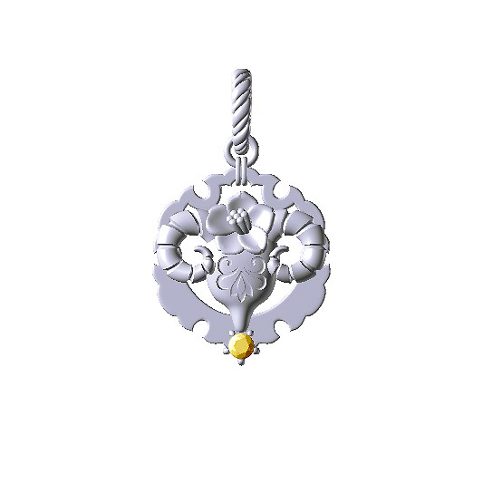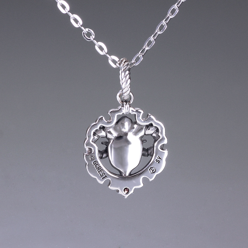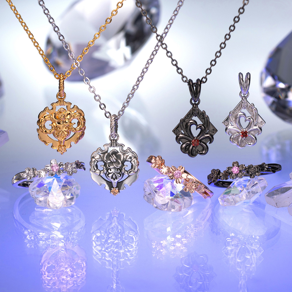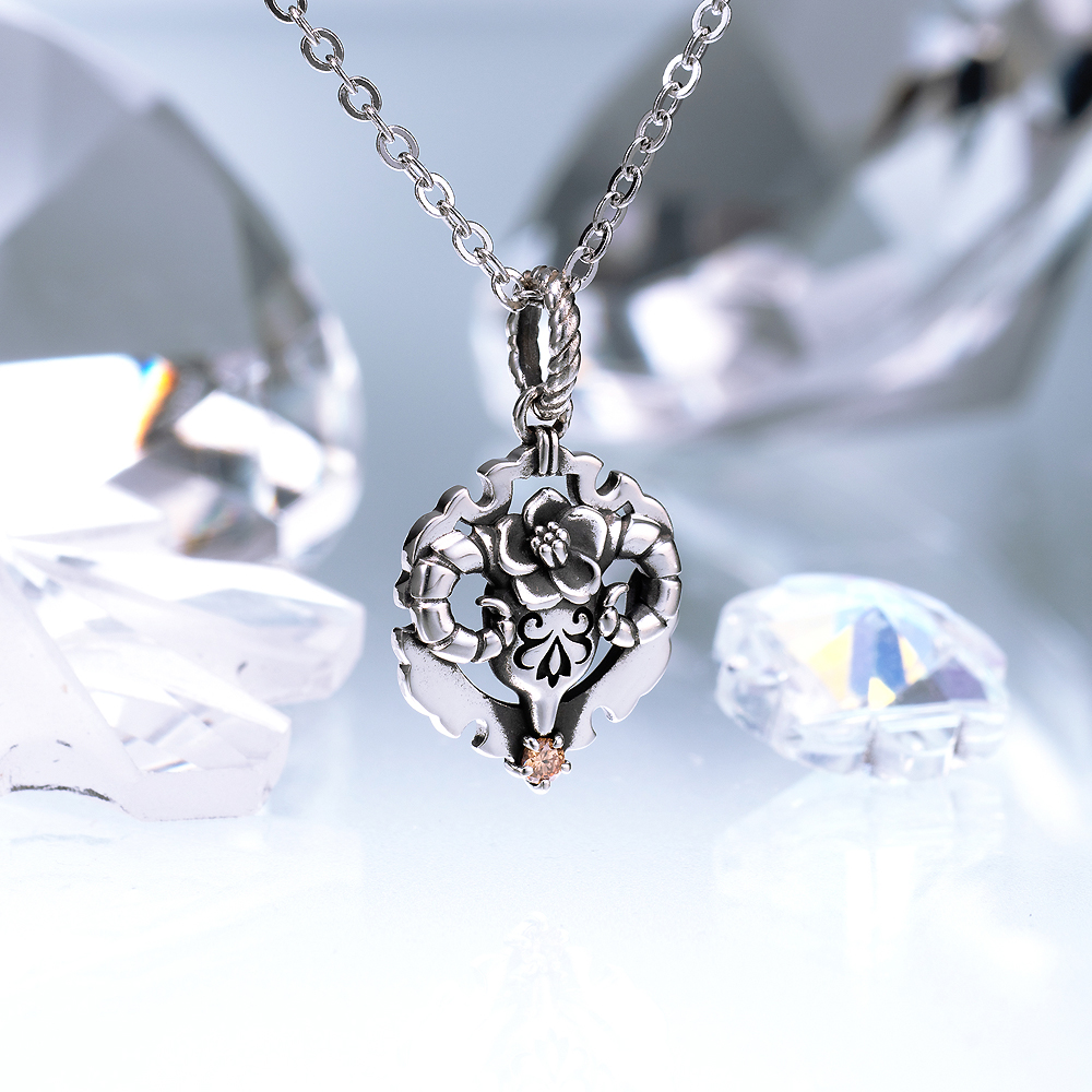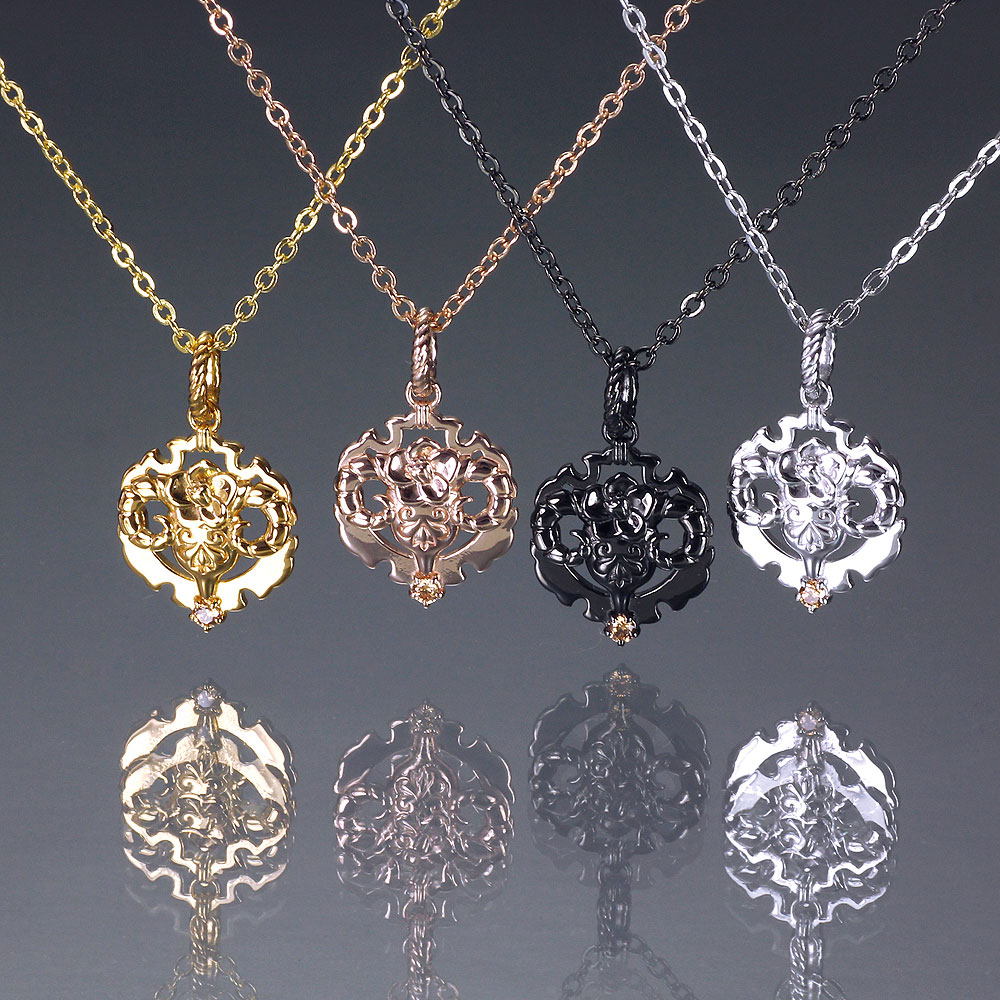 こよみの国・九曜の王子「ヒノト」からあなたへの贈り物をイメージしたペンダント。女性に優しく、男性の前では気を張らずはっきりもの申すヒノトの性格を表現すべく、彼の衣装にデザインされている『未の一族』のマークをアレンジ。さり気にあしらったシャンパンゴールド ジルコニアが上品に煌めく。