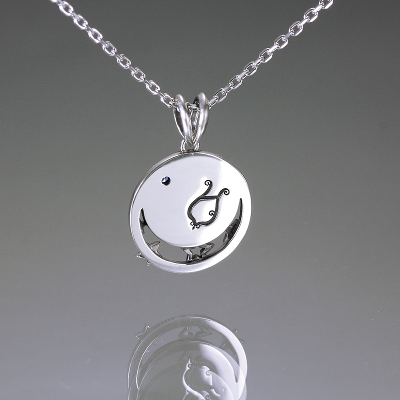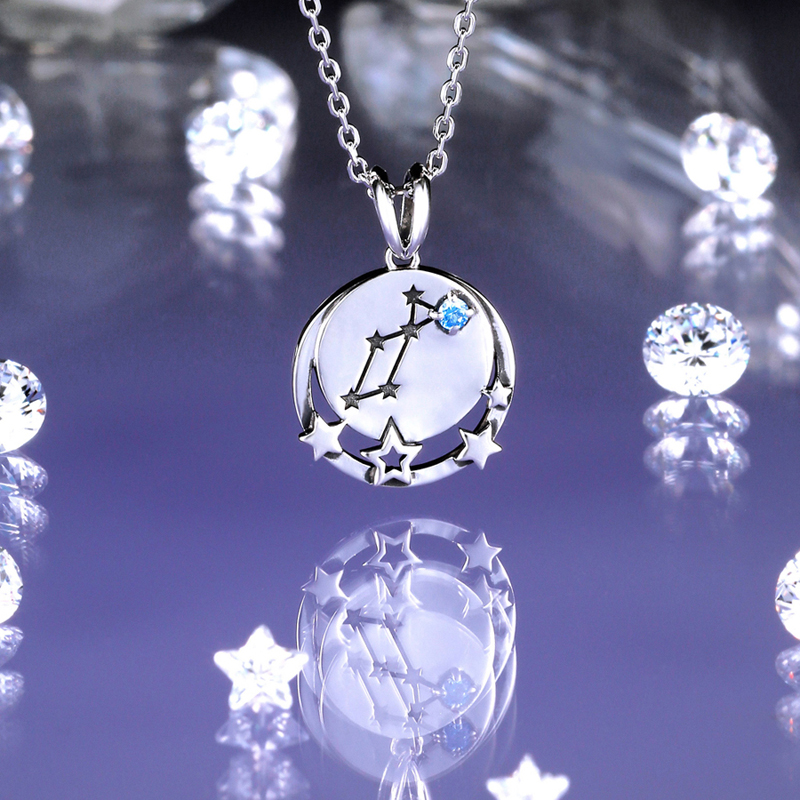 星の国・ガラッシアの王子「ベガ」からあなたへの贈り物をテーマに、『星灯る夜に』のイベントスチルをモチーフにしたペンダント。琴座でもっとも明るい恒星で、七夕のおりひめ星として知られる「ベガ」のポジションに輝石をあしらって。見る角度によって七色の輝きを秘めるディフュージョンブルーキュービックジルコニアが神秘的に煌めく。