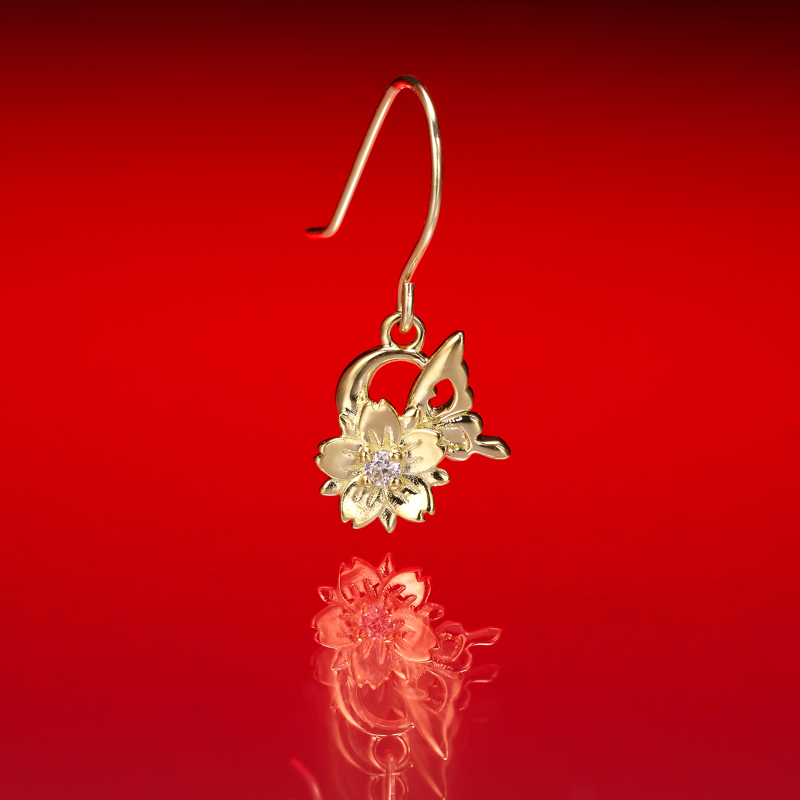 中央にダイヤをセットした「花(桜)」をメインに、花にとまった「蝶」、蝶の羽根模様に「ふぅ(唇)」、夜空に「月(三日月)」を浮かべた風雅な情景をイメージ。メインの桜モチーフは、HAKUEI のタトゥをサンプリング。