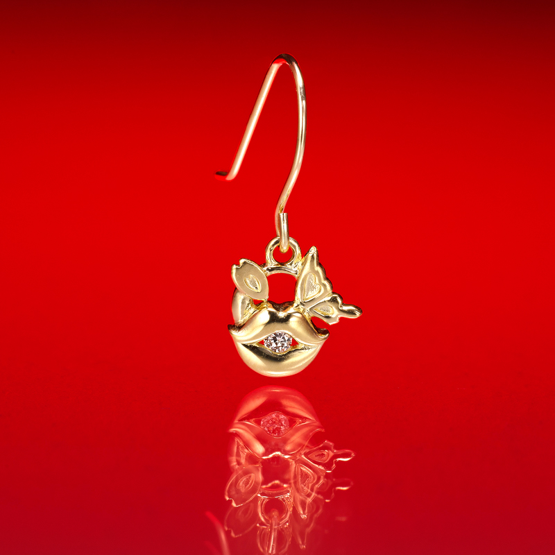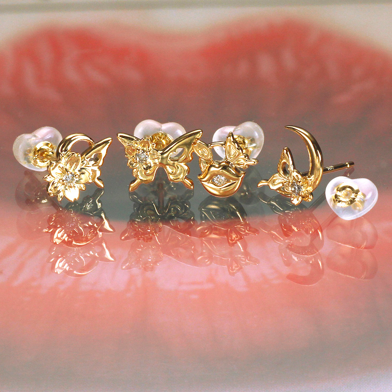 ふぅ〜っと吐息を吹きかける表情の唇にダイヤモンドをセットした「ふぅ(唇)」をメインに、唇で羽根休めする「蝶」、夜空に浮かぶ「月(三日月)」を背景に散りゆく「花(桜の花弁)」の情景をイメージ。蝶の羽根模様にハートを秘めたり細部にもデザインを込める。