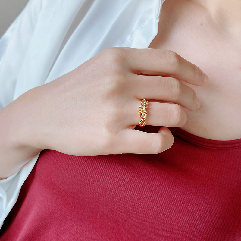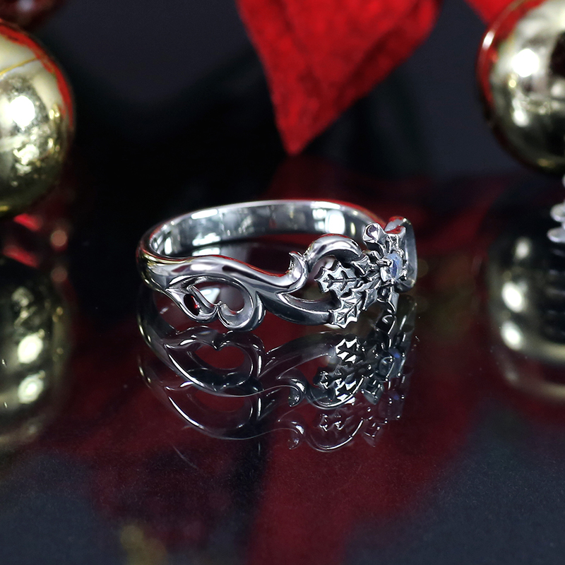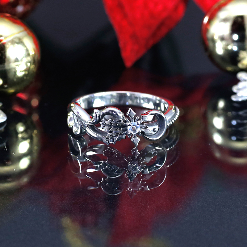 月影の国・クレアブールの王子「ゲイリー」からあなたへの贈り物をテーマに、『最上の輝きを君に』のイベントイラストのイメージモチーフを盛り込んだリング。王子がまとう衣装や装身具をミックスしたデザインは、ファンはもちろん普段使いでもオシャレな仕上がり。中央で上品にキラめくのは、見る角度によってブルーの輝きも秘める天然石ロイヤルブルームーンストーン。