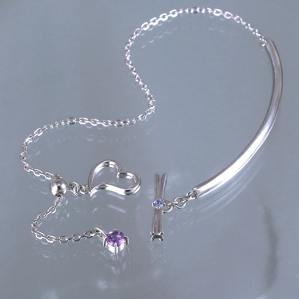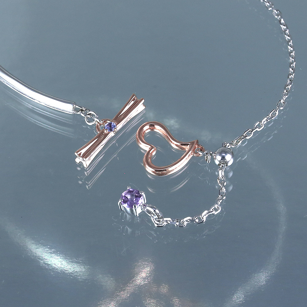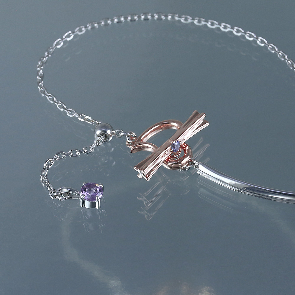ハートのようにも見える唇のサイドアングルに、「Hバー ※1」を通してロックする仕組み。エンドチャームにアメジスト(いて座の守護石)を、Hバーのワンポイントにタンザナイト(12月の誕生石)を添えてドレスアップ。また、シリコンを内蔵したシルバーのスライドパーツを組み込み、サイズを自在にアレンジ(adjust)出来るギミックに。