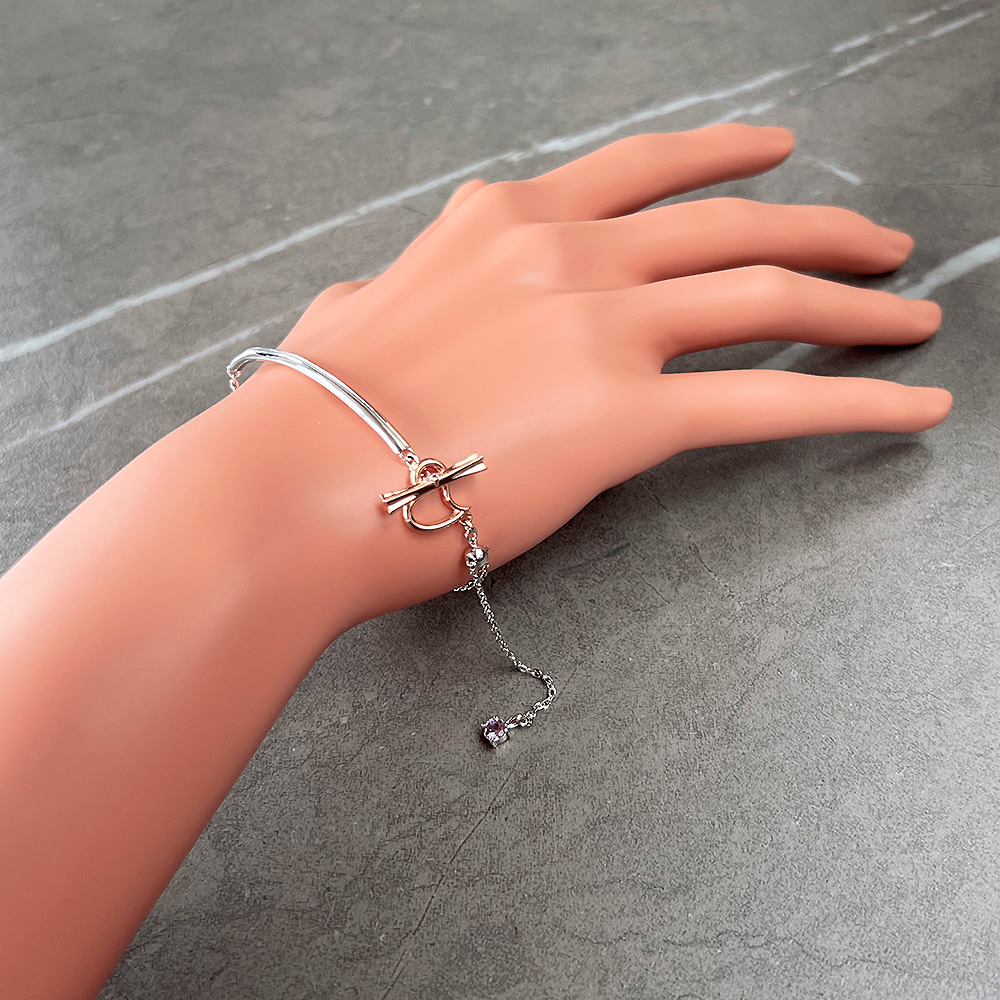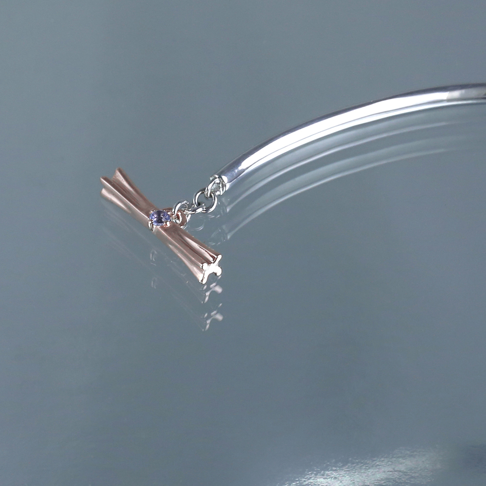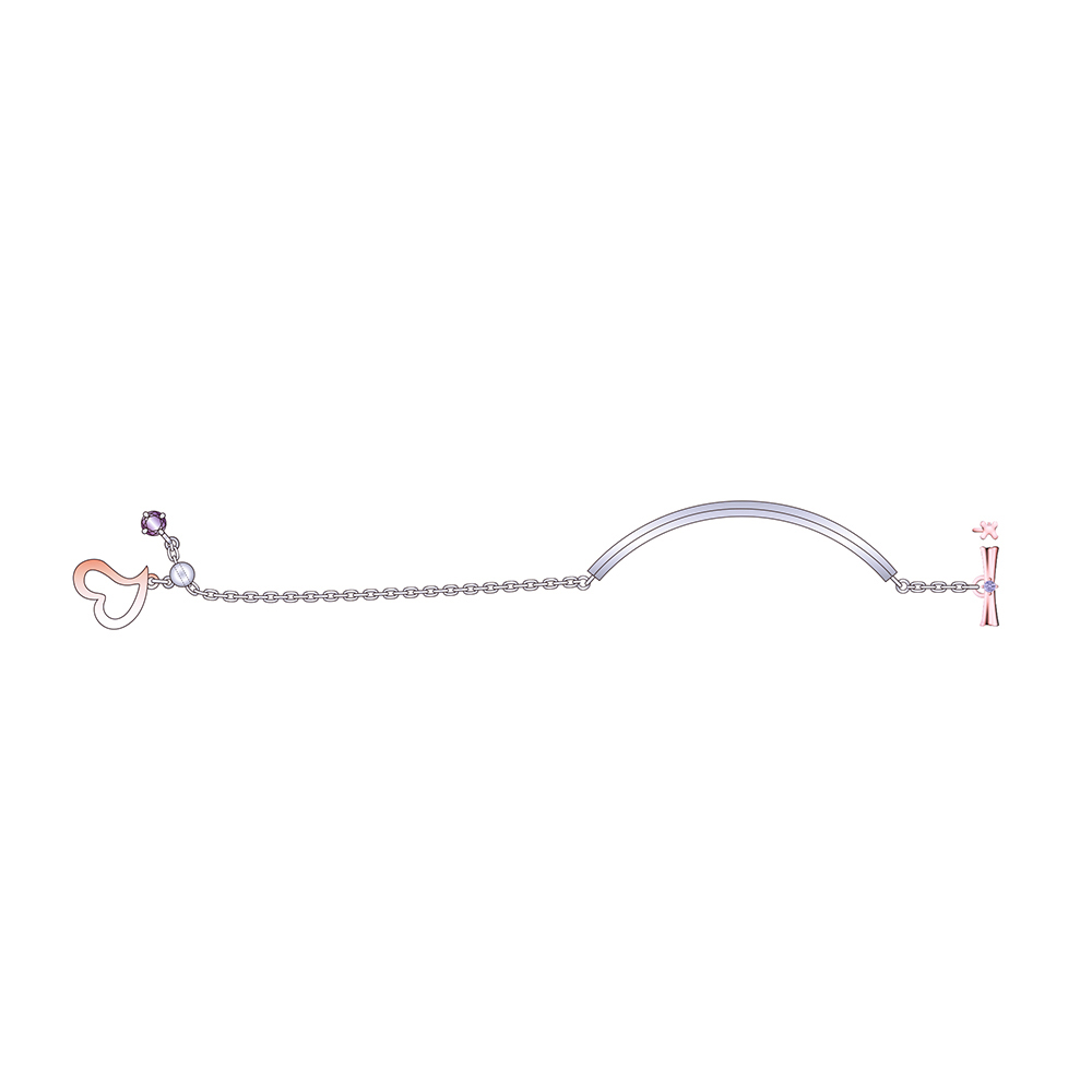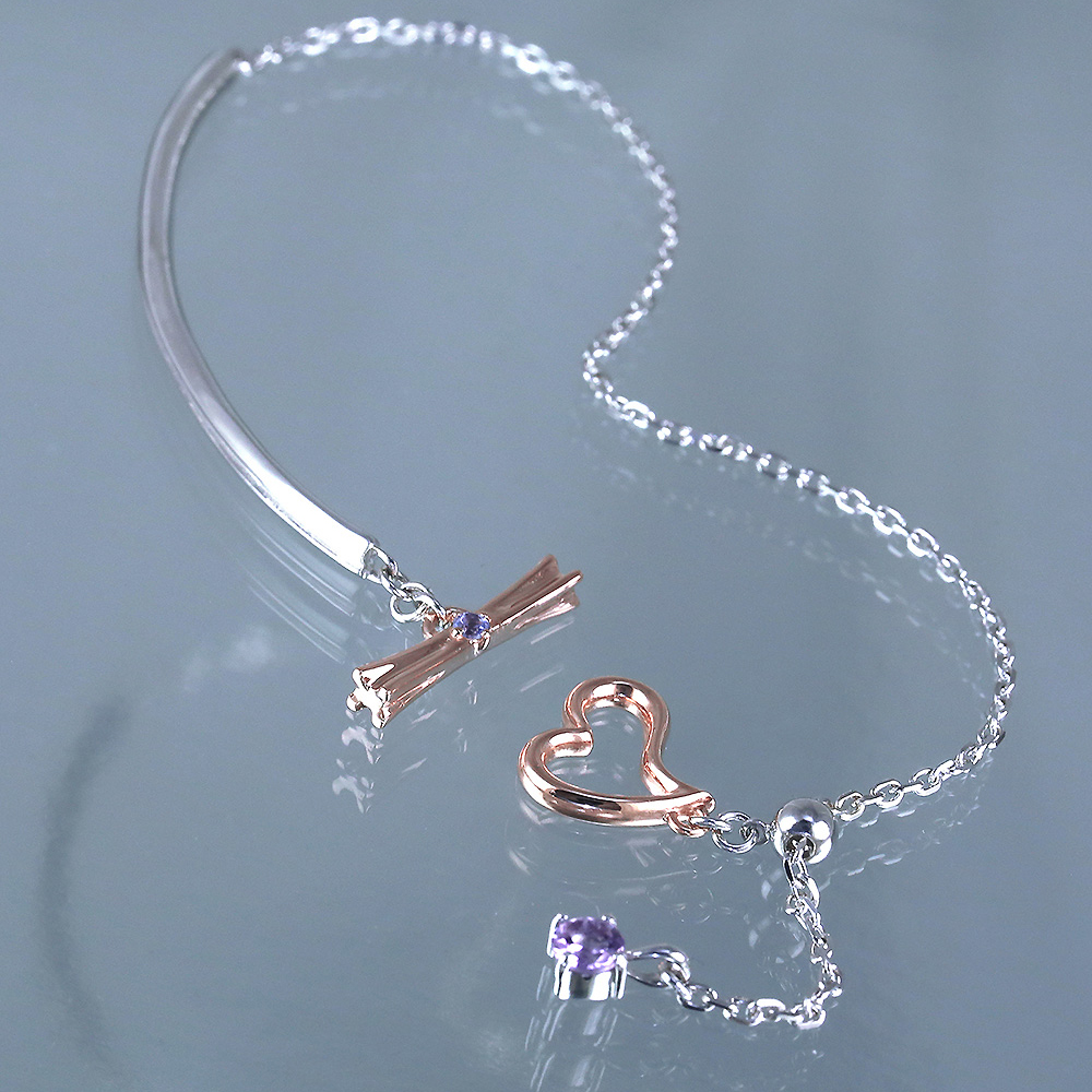 ハートのようにも見える唇のサイドアングルに、「Hバー ※1」を通してロックする仕組み。エンドチャームにアメジスト(いて座の守護石)を、Hバーのワンポイントにタンザナイト(12月の誕生石)を添えてドレスアップ。また、シリコンを内蔵したシルバーのスライドパーツを組み込み、サイズを自在にアレンジ(adjust)出来るギミックに。