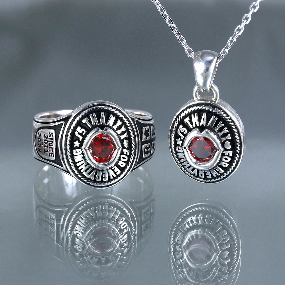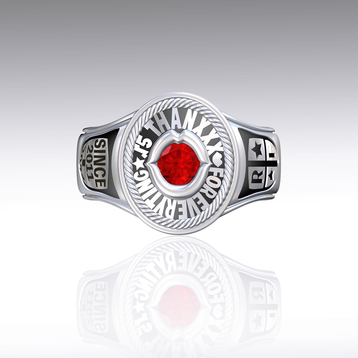 ベゼルに「THANXXX(キスマーク)FOR EVERYTHING ★ √5」(今までありがとう√5)の文字を彫り深く刻む。中央には唇を構え、口内にキラめくレッドキュービックが、墨入れしたシルバーに華を添える。※ストーンカスタム可。ストーンの種類やカラーはお問い合わせください