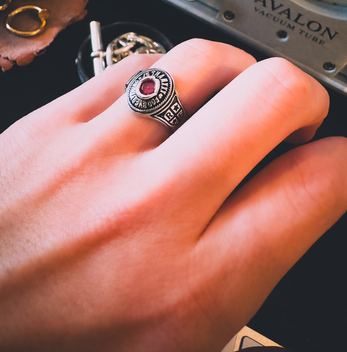 合成画像につきサイズ感のみ参照。リングトップ縦:最大14mm。ゴツすぎず、カレッジリングの存在感を損なわない、ユニセックスで着けられる程よいボリューム感。ちょい強めのピンキー(小指)リングにもおすすめ。リングサイズが分からない場合は リングサイズ表 をご参考までに。※ 計測の仕方により誤差が生じますのでご注意ください。ご購入後のリングサイズ直しは工賃3,000円(税抜・送料別)〜