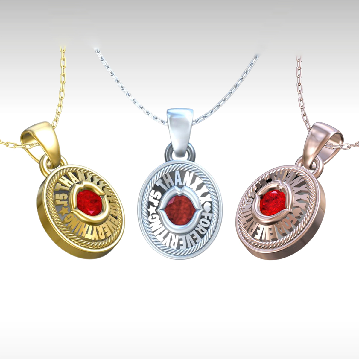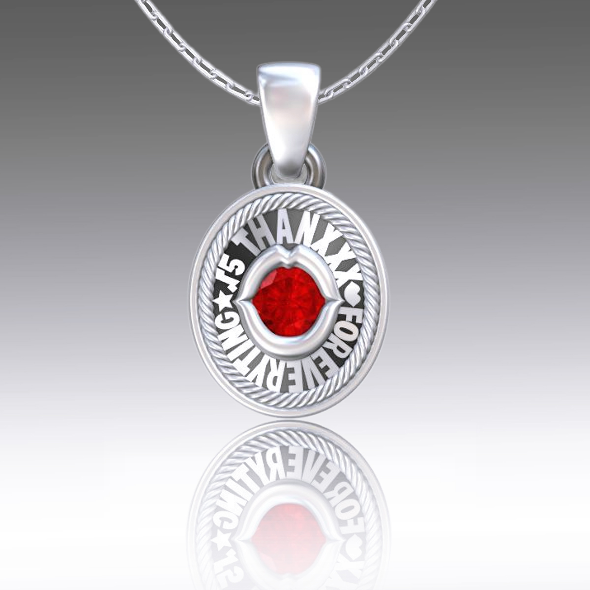 ベゼルに「THANXXX(キスマーク)FOR EVERYTHING ★ √5」(今までありがとう√5)の文字を彫り深く刻む。中央には唇を構え、口内にキラめくレッドキュービックが、墨入れしたシルバーに華を添える。※ストーンカスタム可。ストーンの種類やカラーはお問い合わせください