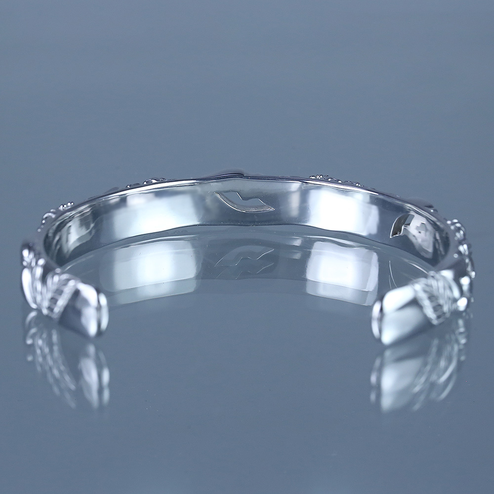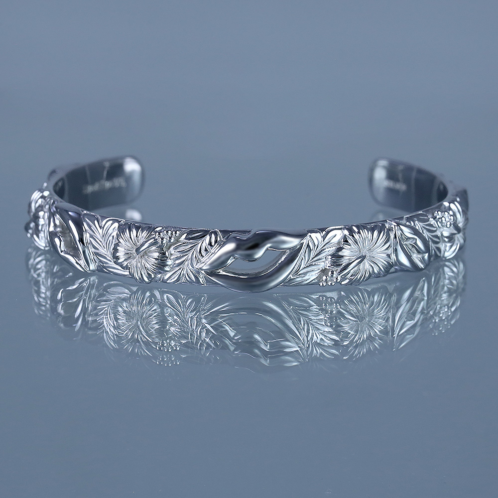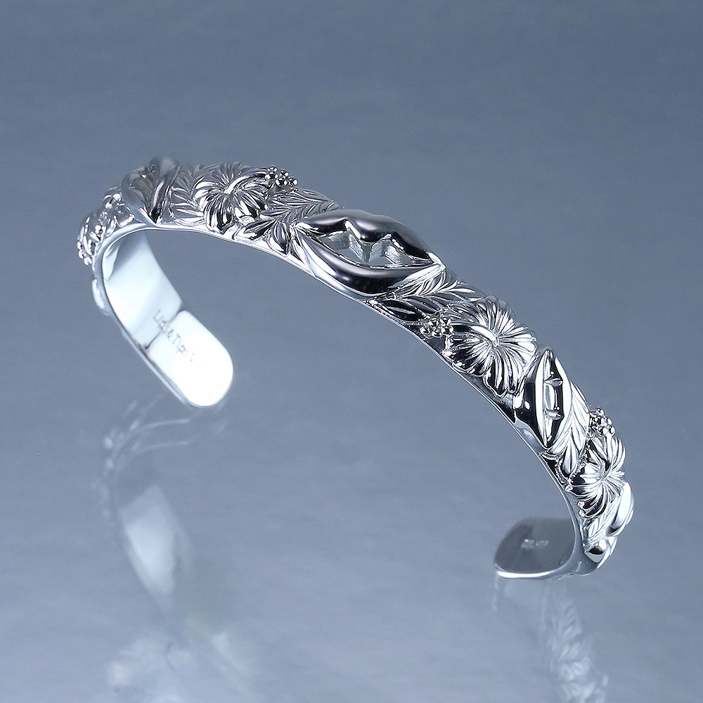 唇、キス(ハート)、ハイビスカス、マイレリーフをアシンメトリーにレイアウト。モチーフが連なるデザインは、終わりのない愛のキスを象徴している。シルバーに ロジウムルージュ を施して造形細部まで白金の輝きに。シルバー特有の経年変化による色褪せや黒ずみを解消しつつ、ニッケルフリーで金属アレルギーにも配慮。バングルボディ幅:約9mm