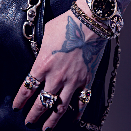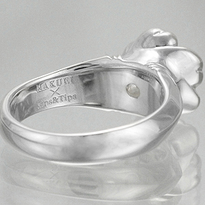 天然石を構えたトップは、リングボディから突出したイメージ。サイドアングルでは唇よりも花のイメージを強調し、ボディとの境界に V 字のスリットを彫り込んでアクセントに。「デザイン性はもちろん、天然石にもこだわった。色彩はもとより、身に着ける人のパワーになるようにね。ホワイトクォーツ(水晶)とガーネット、それぞれの石が持つスピリチュアルな意味や宝石言葉なども含めて感じてもらいたいね」(HAKUEI 談)
