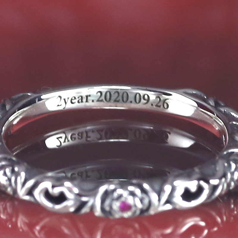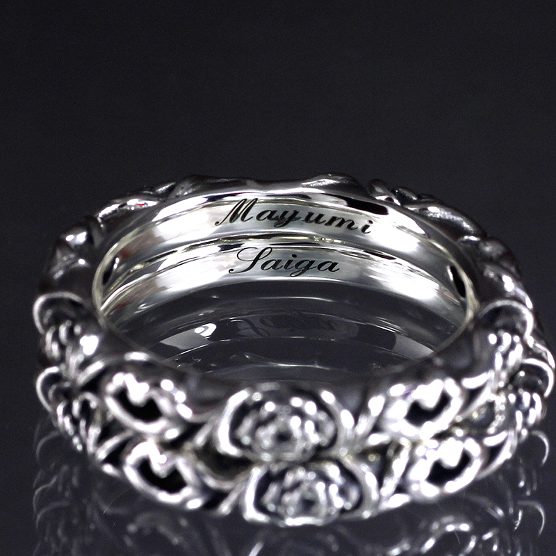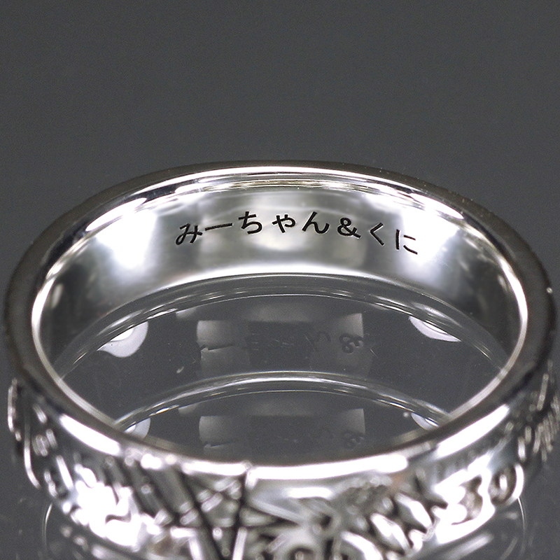 レーザーネーム彫りでお好きな文字が入れられます。かな・カナ・英字・数字ほか、ハートなど簡易的なマークも可。「〜7文字まで 4,200円税抜」※文字数増で料金プラス。スペースによって入れられる文字数に限りあり。詳細はお問い合わせ下さい