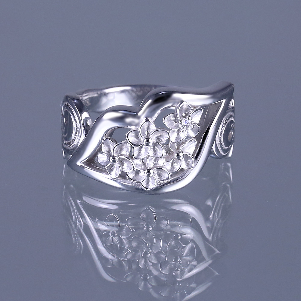 唇いっぱいに咲き誇るプルメリアは、愛する人の息吹「Breath(ブレス)」をイメージ。柔らかい曲線を描くオープンリップにプルメリアが連なり、まるでレイのように華やかさを醸す。装着すると斜めにたたずむ唇とプルメリアの花が、指先で優しく語りかけてくれるような、繊細でロマンチックなイメージを表現。シルバーに ロジウムルージュ を施して造形細部まで白金の輝きに。シルバー特有の経年変化による色褪せや黒ずみを解消しつつ、ニッケルフリーで金属アレルギーにも配慮
