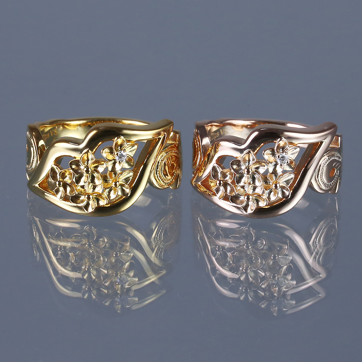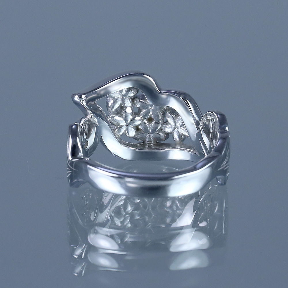 プルメリア裏側も立体的にデザイン。指にしっとりと馴染む装着感も満喫してほしい。好きな言葉やメッセージなど、ネーム彫りカスタムして、自分だけの想いを込めるのもいい。カスタムについてはページ下段の<カスタムオーダーについて>参照