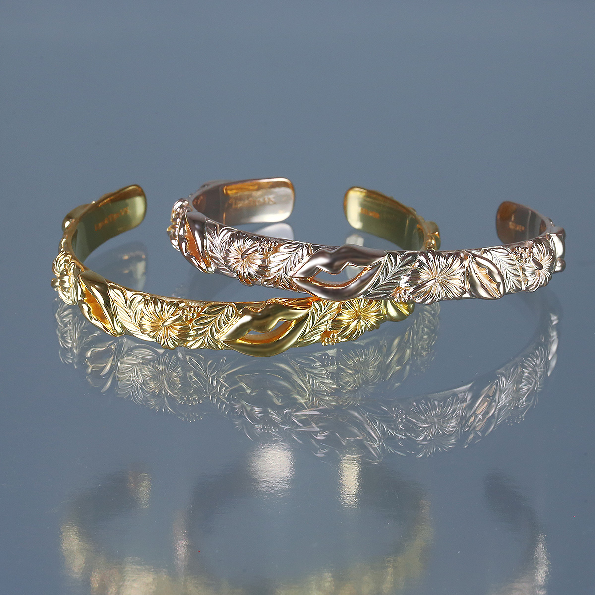 唇、キス(ハート)、ハイビスカス、マイレリーフをアシンメトリーにレイアウト。モチーフが連なるデザインは、終わりのない愛のキスを象徴している。シルバーに ロジウムルージュ を施して造形細部まで白金の輝きに。シルバー特有の経年変化による色褪せや黒ずみを解消しつつ、ニッケルフリーで金属アレルギーにも配慮。バングルボディ幅:約9mm