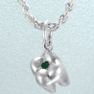 歯の中心にストーンを1石セットし、虫歯治療のニュアンスに仕上げる遊び心◎なカスタム(+3,000円税抜〜)。奥歯が斜めに吊り下がるからストーンも際立つ! こちらは「エメラルド」カスタム(+5,000円税抜)※カスタムご希望の場合はカートに入れてから注文フォームに明記して下さい<サービスでシルバーチェーン(40cm+アジャスター5cm)にアップグレードします>