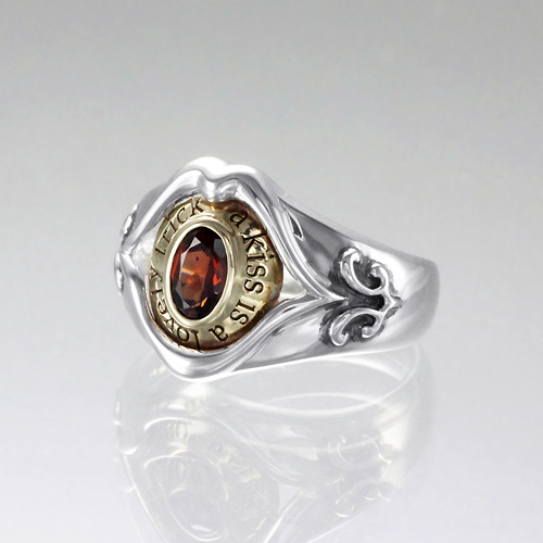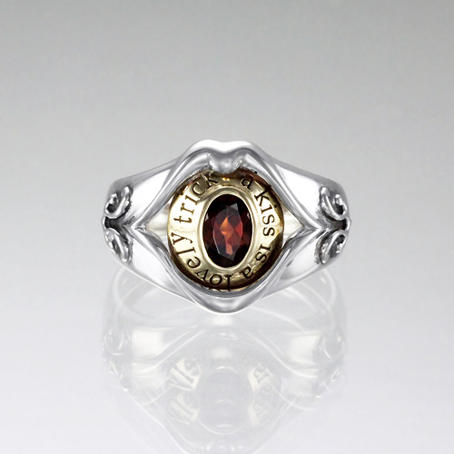 学校名や学位、紋章などを刻み込み、1800年代から広まっていったという歴史あるカレッジリング。そんなメモリアルリングの定番をリップスで表現すると……。唇ラインを描き出したフレーム内に「a kiss is a lovely trick」の文字を刻んだプレートをセットし、中央にオーバルカットのガーネットが輝く。