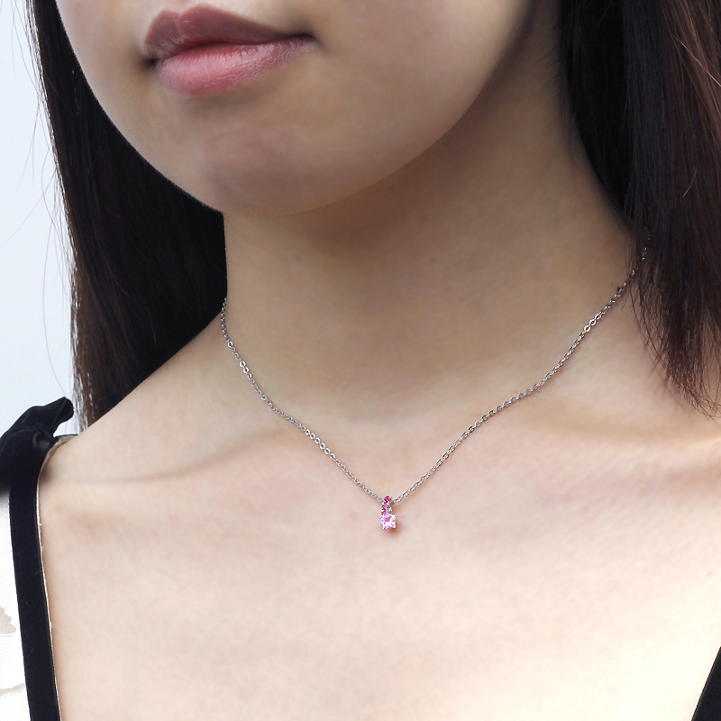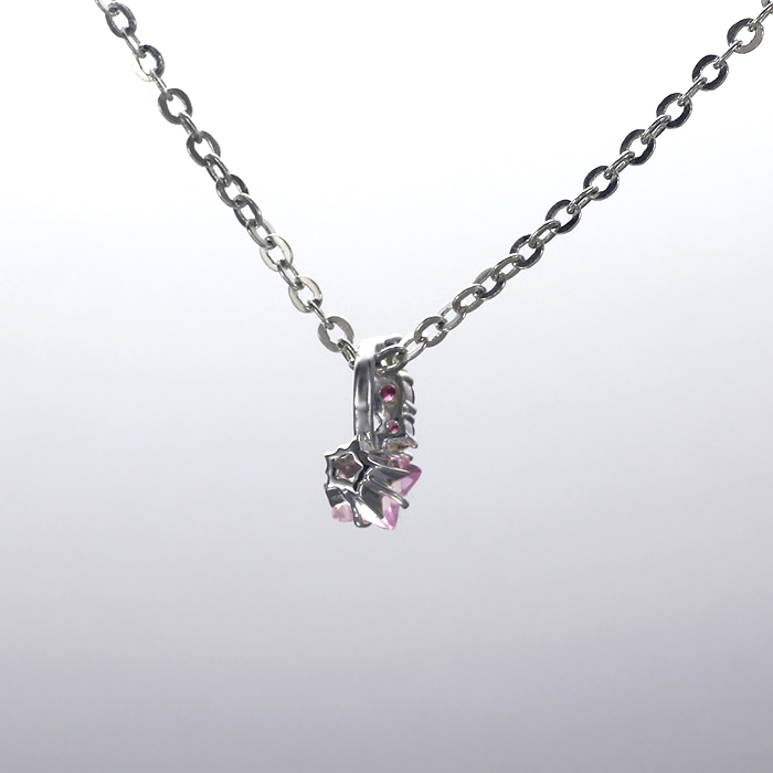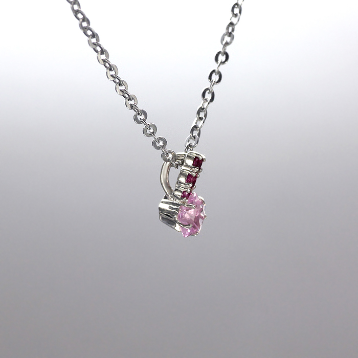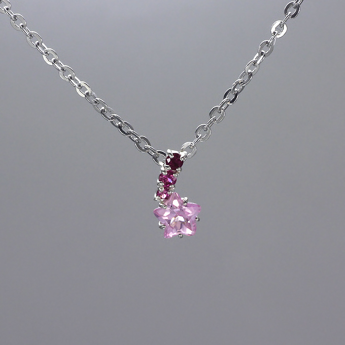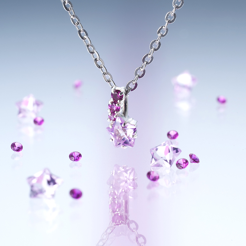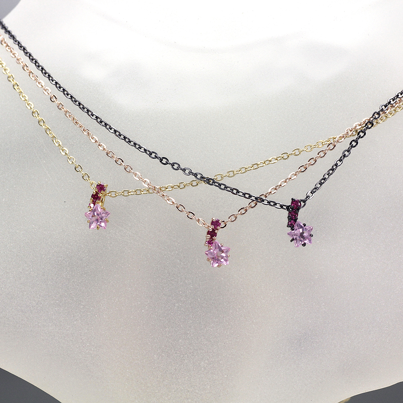 チャラ系声優「椿」モデルは、ロマンチックな「流れ星」モチーフ。スターカットのシンセティックローズサファイアをメインに、大きさの異なるシンセティックルビー3石で流線を描き「星くず」をイメージ。ストーンを全面に主張したキラキラチャームは、ファション問わず胸元を上品に彩る。