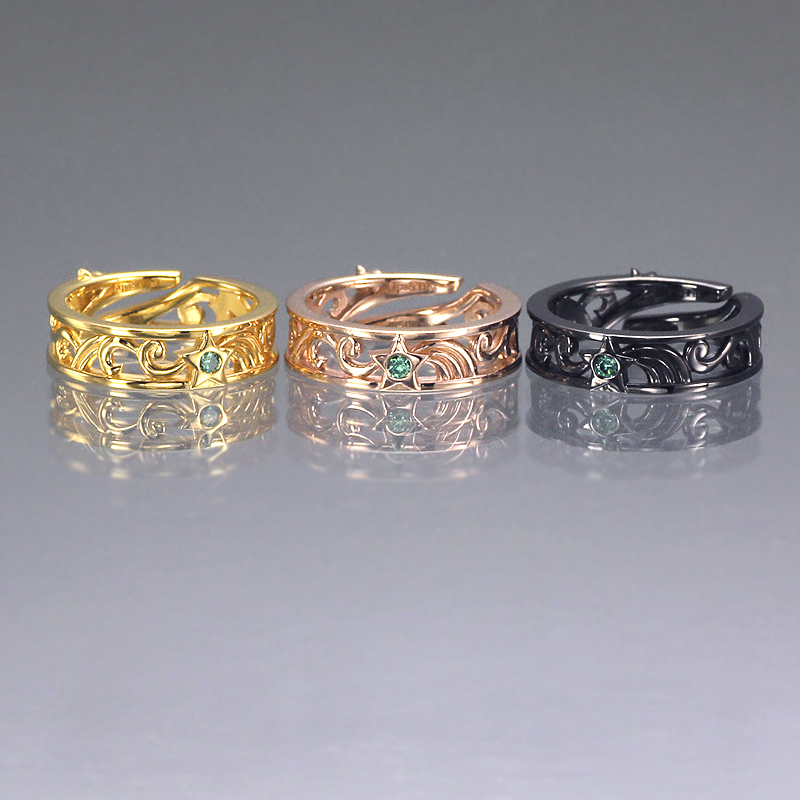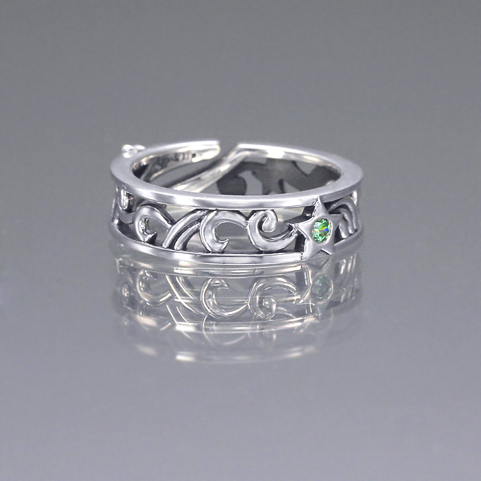 「昴から貴方への贈り物」をテーマにデザイン。スポ根系大学生の彼が選んだデザインは、透かし彫りデザインがクールなリング。中央にデザインした星には、昴のカラーをイメージしたディフュージョングリーン キュービックジルコニアをセット。見る角度によって七色を放つストーンの輝きも満喫して。