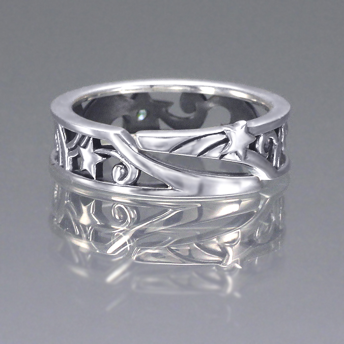 アームの片エンドに流れ星モチーフ、逆サイドの透かし彫り部分にも星をデザインしている。フリーサイズ仕様だから、ご自身でサイズの微調整が行えます。拡張・縮小を繰り返すと破損の原因になりますのでご注意下さい。<注文フォームにてご希望のリングサイズ(推奨サイズ5〜15号 ※ 4号以下は不可)を必ず明記して下さい。サイズ合わせして発送いたします>