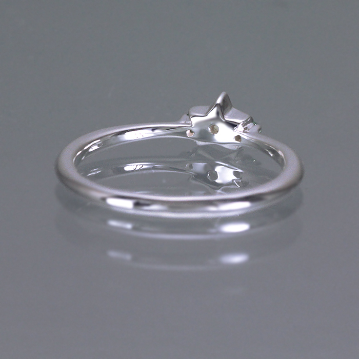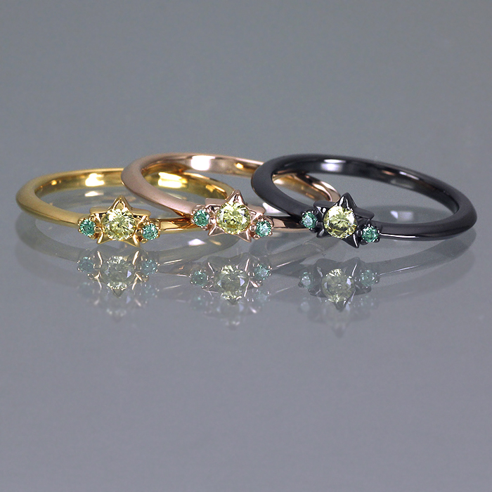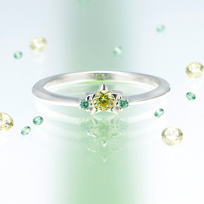 「雅臣から貴方への贈り物」をテーマにデザイン。ヘタレ系小児科医からの贈り物は、イメージモチーフの星いっぱいに雅臣カラーのストーンを輝かせた、長兄らしくオトナめシンプルな仕上がり。星をロマンティックに表現したデザインは、将来の約束をイメージさせてくれる!? メインストーンの両サイドには、見る角度によって輝きの表情を変えるディフュージョングリーンキュービックジルコニアを2石。