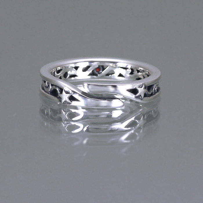 リングのアームをセパレートしたフリーサイズ仕様。1〜2号程度のサイズ微調整ならご自身でも簡単に可能ですが、過度な拡張・縮小は真円がくずれたり、調整を繰り返すと破損の原因になりますのでご注意下さい。7号・8号サイズをオーダーの場合はアームを1〜2mmカットしてお届け。<推奨サイズは7〜16号> 両サイドに星モチーフをあしらってアクセントに★ <オーダー時は注文フォームにてご希望のリングサイズを明記下さい>