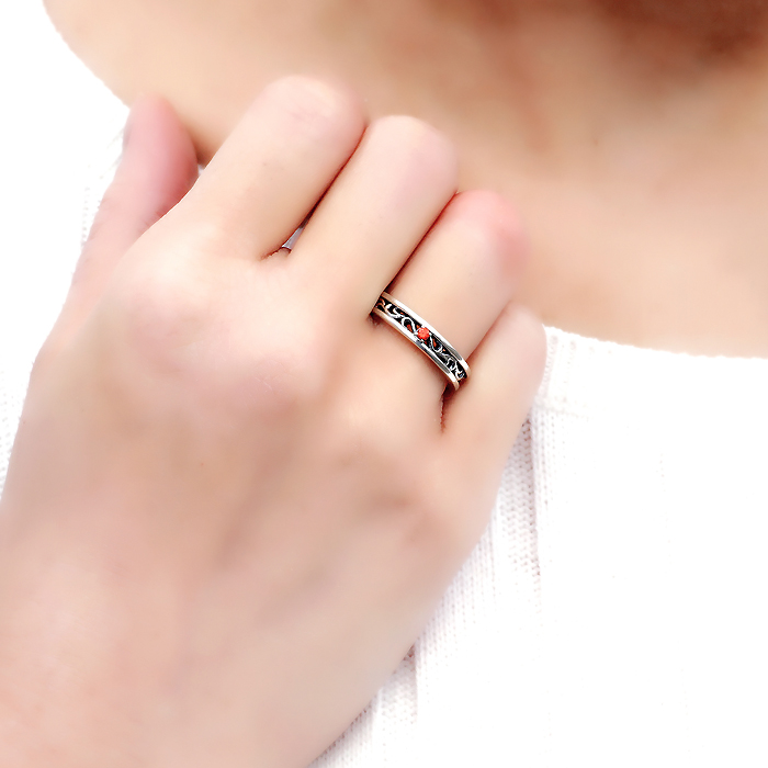 装着イメージ。リング全体にデザインが続いているから、どの指にコーデしても◎。参考:リングを着ける指の意味 またリングサイズが分からない場合は リングサイズ表 をご参考までに。※ 計測の仕方により誤差が生じますのでご注意ください