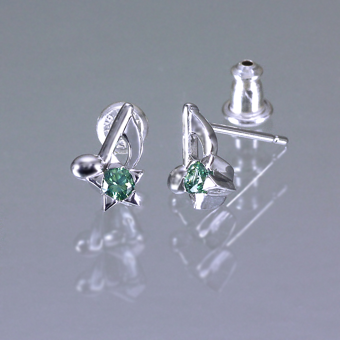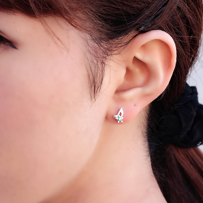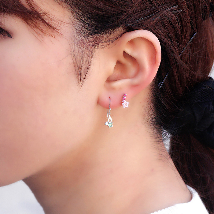 ピアスの種類は2タイプ。デフォルトはフック(左)、カスタムオーダーでスタッド(右)も可。星モチーフの石座には、見る角度によって七色を放つディフュージョングリーン キュービックジルコニアが煌めく。ファション問わず耳元をポップにセンスアップ。<スタッドタイプご希望の場合は、カートに入れてから注文フォームの連絡事項欄に「スタッド」と必ず明記して下さい。記載がない場合はフックにて手配させて頂きます>
