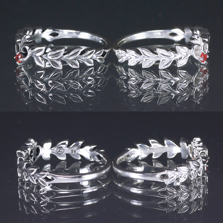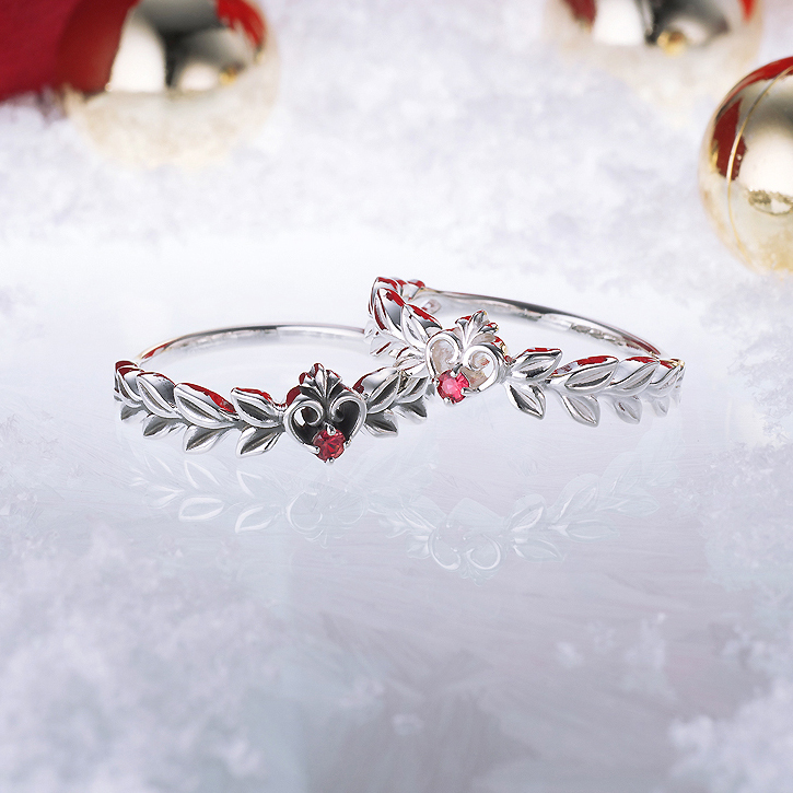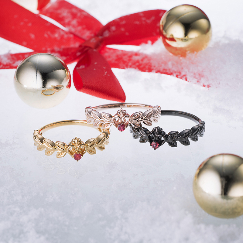 アングルバリエーション。レッドサファイアが煌めくハートのトップ両サイドを飾るのは、紅茶の葉! クリスマスプレゼントらしいムードも感じさせるデザインに仕上がっています。画像左がイブシ仕上げ、右がホワイト。指の腹部分にくるアーム部分はプレーンな鏡面に。