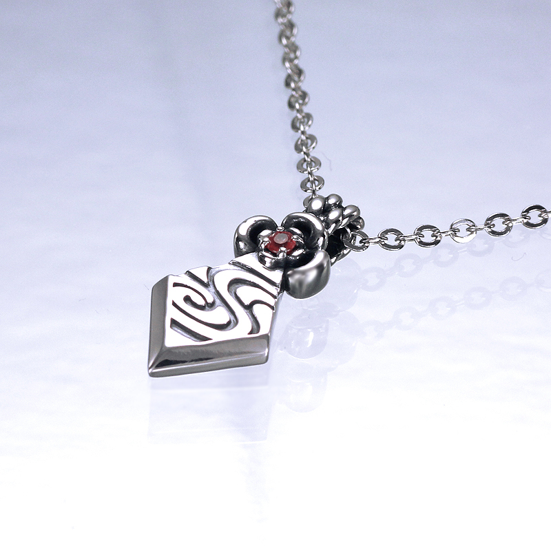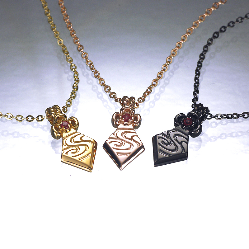 幕の国「高杉晋作」から貴女への贈り物をイメージしたペンダント。晋作の衣にも描かれている流水紋様をあしらって和風な仕上がりに。チェーンを通すバチカン部分は紐の結びをデザインしている。