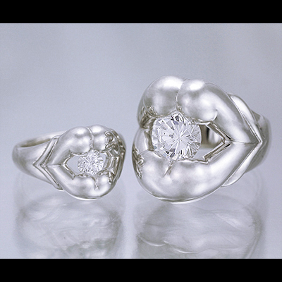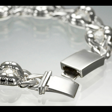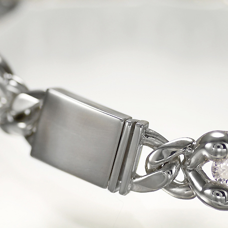 唇とヒップのコラボレーションが繰り出すボリューミーな Hips Lip モチーフを、ソリッドなイメージのキヘイチェーンで連結。上唇が男性のヒップ、下唇が女性のヒップをイメージし、「愛のカタチ」をストーンの輝きでモザイクに秘める……。そんな遊び心を秘めたオリジナルモチーフ。ストーンはキュービックジルコニア(クリア)のほか、カラーバリエーションや天然石などカスタムオーダー可能。