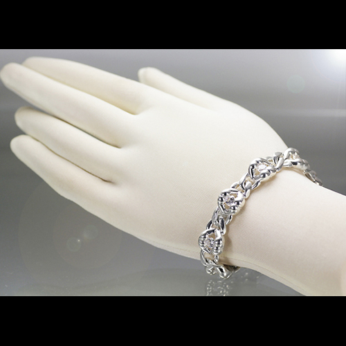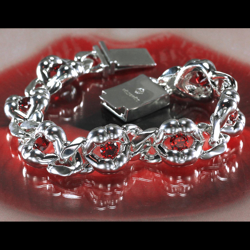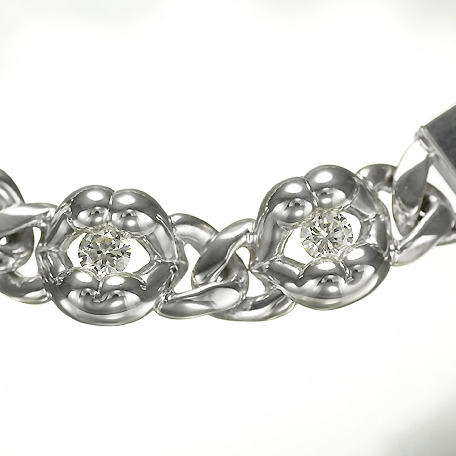 唇とヒップのコラボレーションが繰り出すボリューミーな Hips Lip モチーフを、ソリッドなイメージのキヘイチェーンで連結。上唇が男性のヒップ、下唇が女性のヒップをイメージし、「愛のカタチ」をストーンの輝きでモザイクに秘める……。そんな遊び心を秘めたオリジナルモチーフ。ストーンはキュービックジルコニア(クリア)のほか、カラーバリエーションや天然石などカスタムオーダー可能。
