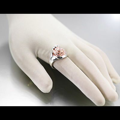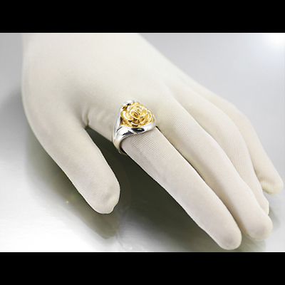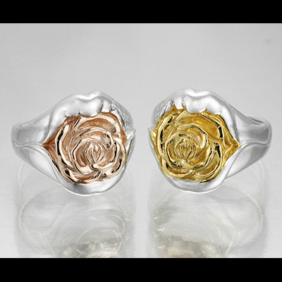 バラ(Rosetta)モチーフのみイエローゴールドルージュ(右)、リップゴールドルージュ(左)でコーティングしたカスタムが可能(各+4,000円税抜)。唇に優しく包み込まれた立体的なバラ(Rosetta)が、ゴールドルージュによってセクシーな存在感を放つ。ルージュカスタムについてはこちらのページ 参照。カスタムについてはカートに入れてから注文フォームにてご記入下さい。※ 黒く見えるのはカメラの写り込みによるものです