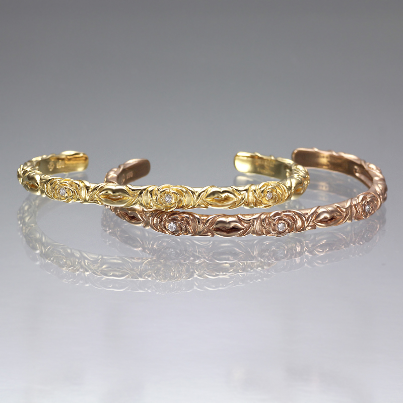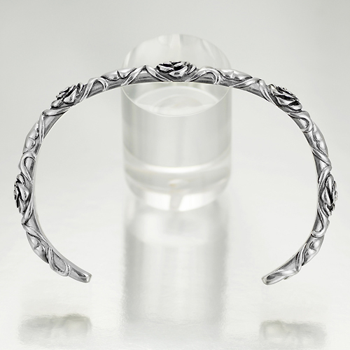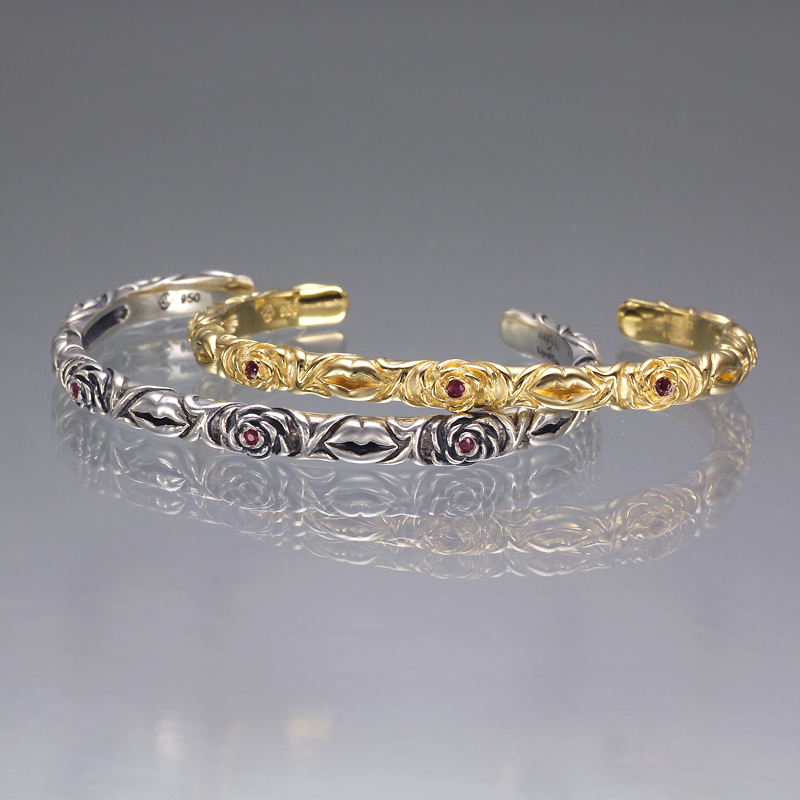 バラを5輪、唇を6つ構える。細身ながらも厚みをもたせているから着け応えあり。バラ(Rosetta)を中心に構え、茨が迷路のように取り巻く。さらにバラが茨を取り巻く情景の中に、唇(激情の愛)が切なさを切り裂いて潜んでいるイメージを具象。