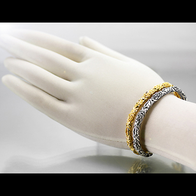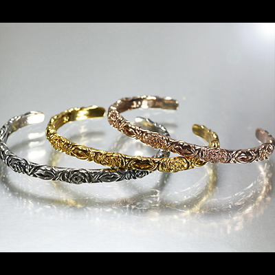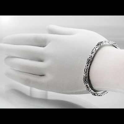 装着サイズイメージ。Rosetta Lip リング とセットでコーデするのもオススメ。バングル幅:約6mm、厚み:約4mm、バングル内径縦:約45mm、バングル内径横:約6mm ※ バングル内径はベースとなるサイズです。ボディの開閉によって簡単にサイズ調整可能
